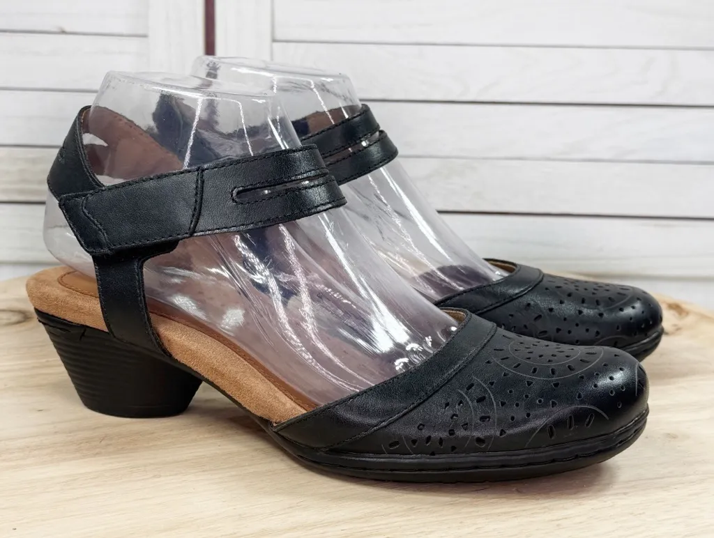 Rockport Cobb Hill Laurel Perforated Block Heel Mary Jane Shoes Black Size 7.5 Jet black Leather upper Suede cushioned insole Perforate laser cutout toe Closed toe Hook & loop tape ankle strap Faux stacked block heel Rubber sole Excellent preowned condition Casual Office Comfort Gorpcore Hipster Langenlook