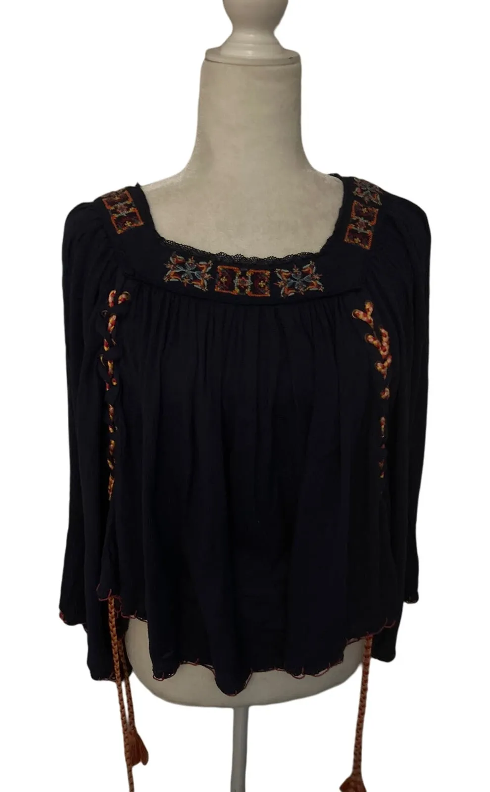 Style: Boho embroidered top with tassel embellishments Color: Blue/Orange/Pink/Gold Size: M Armpit: 21" Length: 22" Sleeve: 25" Condition: Good, sleeve thread needs tightening. Does not effect wearibility