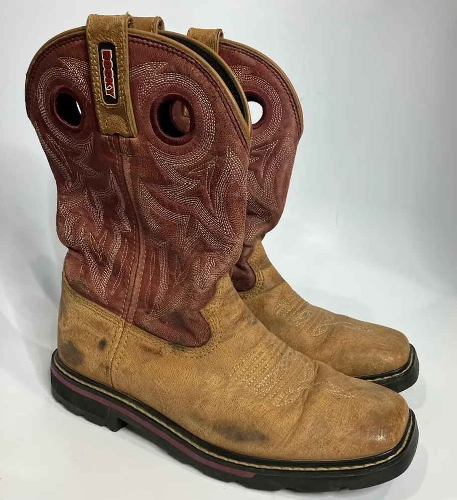Rocky women’s 10” Farmstead leather boots Mid calf, pull on boots western, cowgirl boots brown/purple size 6.5 Has some cosmetic stains on the leather, overall good preowned condition! Please see additional pictures. Bundle 2 or more items & save! Open to reasonable offers. 💜🖤❤️ White shelves