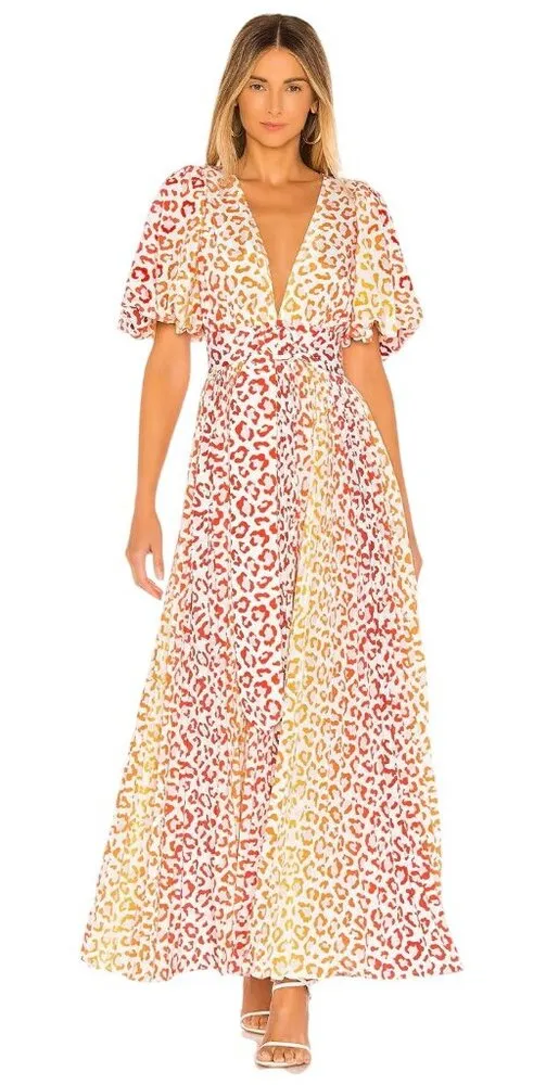 Rococo Sand Avana Leopard Print Puff-Sleeve Maxi Dress Rococo Sand dress in animal print in reds and yellows. Maxi dress with puffed short sleeves, fluid, and flattering fabric. V neckline that enhances the figure and fluid fall. It is a dress that you can wear in spring and summer nights, and you will always be perfect. Self: 100% polyester Lining: 100% viscose Dry clean only Partially lined Hidden side zipper closure Puff sleeves with sequin embellishment Imported Made in India Revolve Style No. ROCS-WD69 Manufacturer Style No. RS-AVANA-1313 Color: Orange MSRP: $497 Size & Fit Fits true to size, order your normal size Body-skimming fit through bust and waist; relaxed fit through hips Non-stretch fabric Designed for a floor-length look Approx. 58" from back of neck to hem Features: • Totally Sold out on Revolve! Size: Womens XS Measurements taken flat across, Bust 15 in / 38 cm Waist 12 in / 30 cm Condition: New With revolve partial tag, no belt Tags: revolve, anthropologie, boho, bohemian, sexy, mini, eyelet, cocktail, party, beach, vacay, vacation, summer, boho bohemina, hippie, 70s, mexico, resort, destination, bride, rehearsal dinner, retro