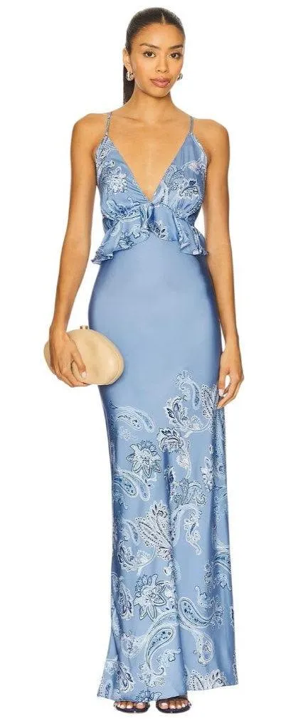 A print that feels as endless as the night sky Self: 96% polyester, 4% lycra Lining: 100% viscose Dry clean only Partially lined Hidden side zip closure Flared design at waist Paisley design Midweight sateen fabric Made in India Revolve Style No. ROCS-WD348 Manufacturer Style No. RS-NAVY-2535 Color: Blue MSRP: $398.00 Size: Womens L Measurements taken flat across, Bust 15 in / 38 cm Hips 20 in / 51 cm Length 60 in / 152 cm Waist 15 in / 38 cm Condition: New With revolve partial tag Tags: western, country, night out, party, event, date night, sexy, bodycon, graduation, mini, cocktail, going out, bright colorful, fancy, wedding guest, sheath, brunch, bachelorette, simone, rush, sorority, designer, luxury, high end, runway, holiday, nye, new years, xmas, christmas,