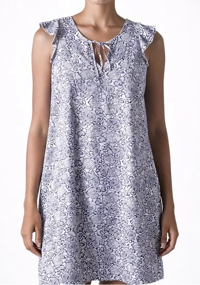 Roberta Roller Rabbit Size: XS Blue and white Floral block print Sleeveless tunic dress with ruffle trim Split neckline with tie keyhole detail Straight hem Lightweight, breathable, semi-sheer 100% Cotton Hand wash cold, line dry in shade Excellent pre-owned condition Chest: 17" Waist: 19" Length: 34" Roberta Roller Rabbit dress, block print tunic, cotton summer dress, blue white floral, boho resort wear, beach cover up, coastal style, sleeveless dress, Indian cotton print, casual lightweight dress, vacation outfit, minimalist boho