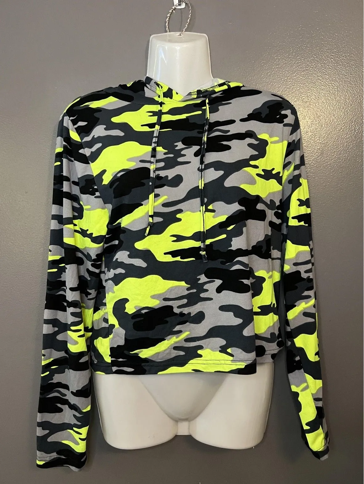 Gently worn set with fabric clean and vibrant, no stains, holes, or pilling on hoodie or pants. Elastic waistband and drawstrings are intact and functional, interior brand and care tags present; original retail tags removed. Brand: Roma Concept Item: Womens two-piece hoodie and pants loungewear/activewear set. Color/Pattern: Multicolor neon yellow, gray, and black camouflage print. Gender: Womens Size on tag: 1X (plus size). Material: 92% polyester, 8% spandex soft stretch jersey knit. Details: Long sleeve pullover hoodie with drawstring hood and cropped length, matching pull-on pants with elastic waistband and drawstring, tapered leg silhouette, lightweight unlined fabric, allover camo pattern. Occasion/Style: Casual wear, loungewear, athleisure, and light activewear. Country of manufacture: Made in China. Tag/label info: Brand label reads 'Roma Concept'; fabric content tag lists 92% Polyester, 8% Spandex, size 1X, RN# 151871. Care instructions (per tag): Hand wash cold, use non-chlorine bleach when needed, dry flat, cool iron if needed, do not dry clean. Has alot of stretch Top PTP 19" Length 19" Pants Waist 30" Rise 11" Inseam 31" bin 64 2586