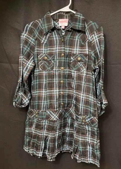 This vintage-style plaid button-up shirt dress features a classic design suitable for various occasions. The medium-sized dress, made by Romeo and Juliet Couture , combines comfort and style with its cotton blend fabric. With long sleeves and a flattering fit, it's a versatile addition to any wardrobe. SKU 7585 • Button-up front with brass-like buttons • Two chest pockets with buttons • Rolled-up sleeve design • Pleated skirt detailing Size: Womens L Condition: Pre-Owned Good This item has been cleaned, sanitized and deodorized. Although we clean our items additional cleaning may be needed such as spot treatments, etc.