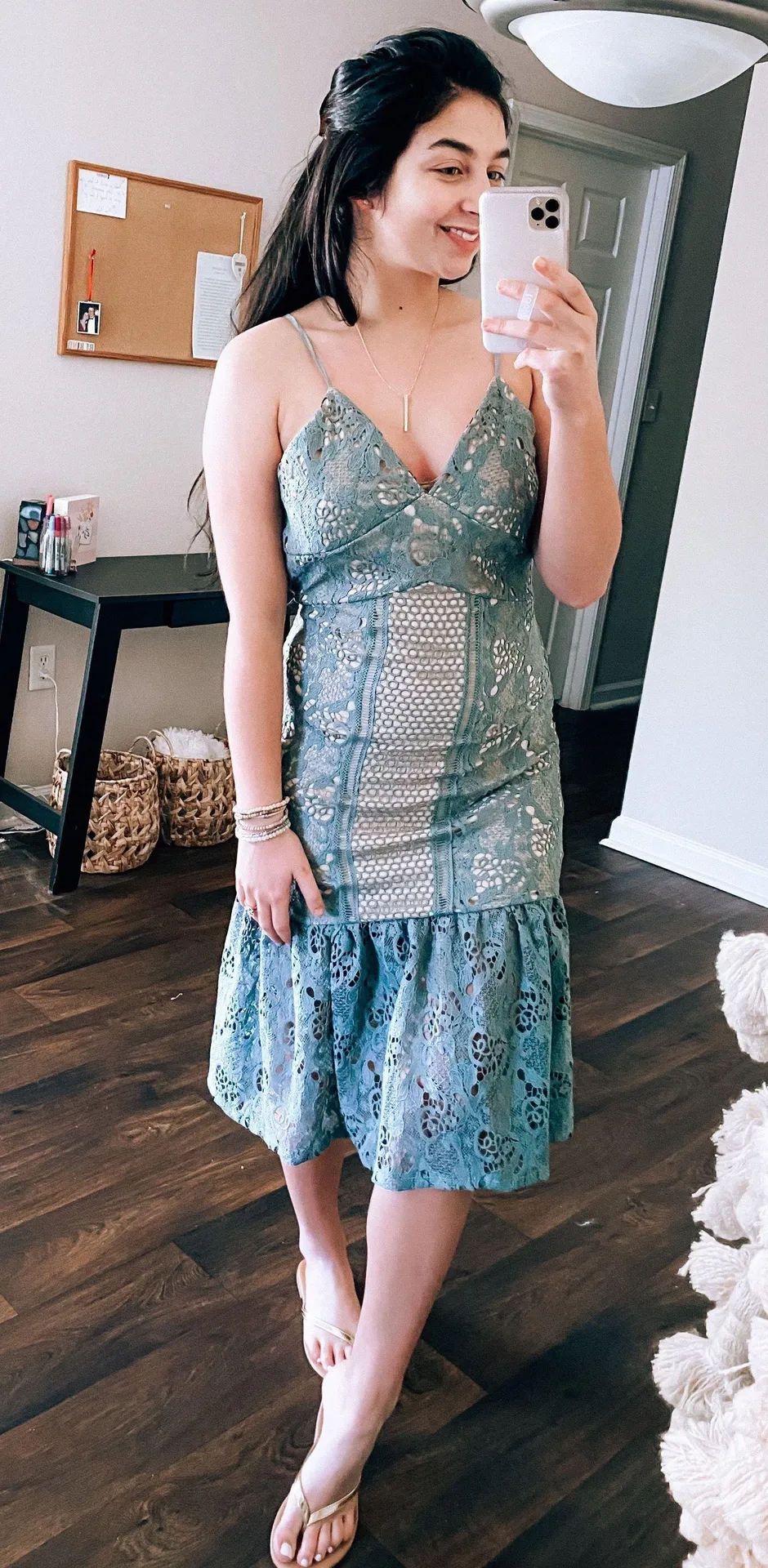 Muted blue/green “dusty sage” lace midi length dress with nude underneath! Zipper on side. For heigh... Show more