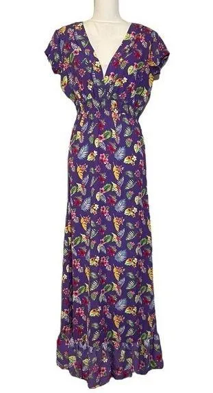 NWT: brand new with tags! Colorful purple maxi dress with a tropical floral print. Ruffled hem, surp... Show more