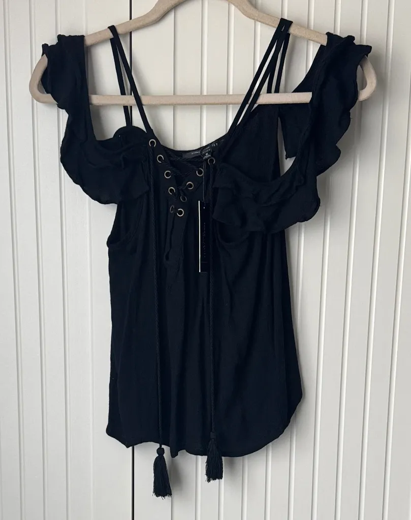 Chic black blouse with lace-up detail and ruffled straps. Ideal for versatile styling.
