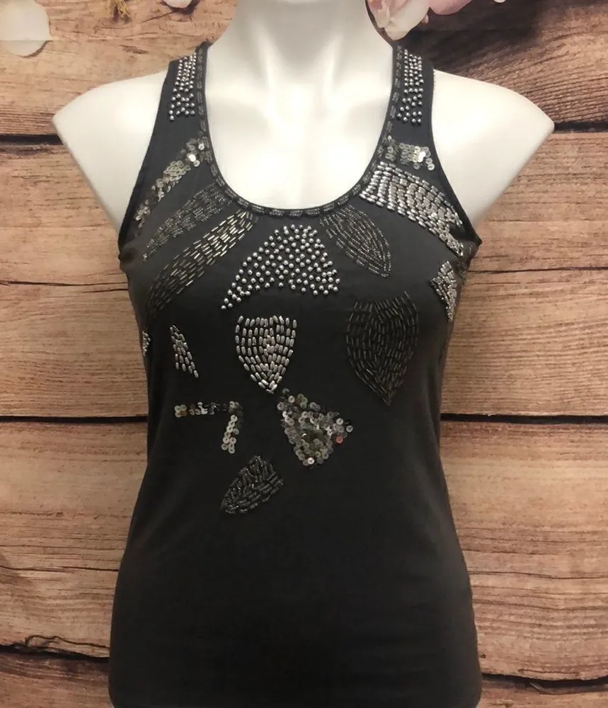 Romeo & Juliet Couture gray racerback tank • beautiful beading • 20.5” shoulder to hem • 17” armpit... Show more