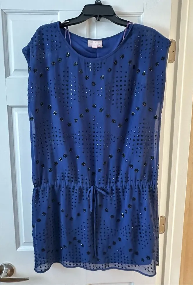 Stylish navy dress with black details. Ideal for casual outings. Comfortable and trendy.