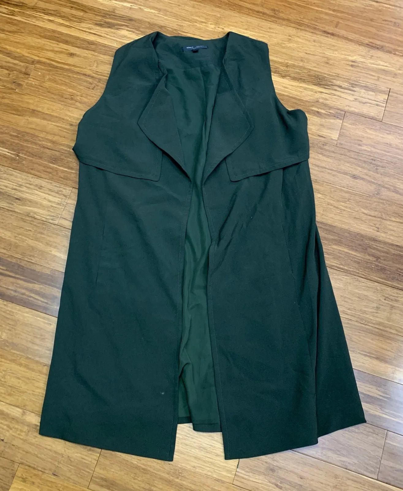 Romeo Juliet Couture sleeveless long vest in a rich olive green hue. This stylish layering piece features a flattering drape front and an open front design, perfect for adding a chic touch to any outfit. The back of the vest has a subtle split detail for ease of movement and a modern silhouette. Keywords: drape front vest, sleeveless jacket, long vest, olive green, women's outerwear, layering piece, fashion vest, minimalist, chic, modern, open front, tailored vest Very good used condition. Open to offers!