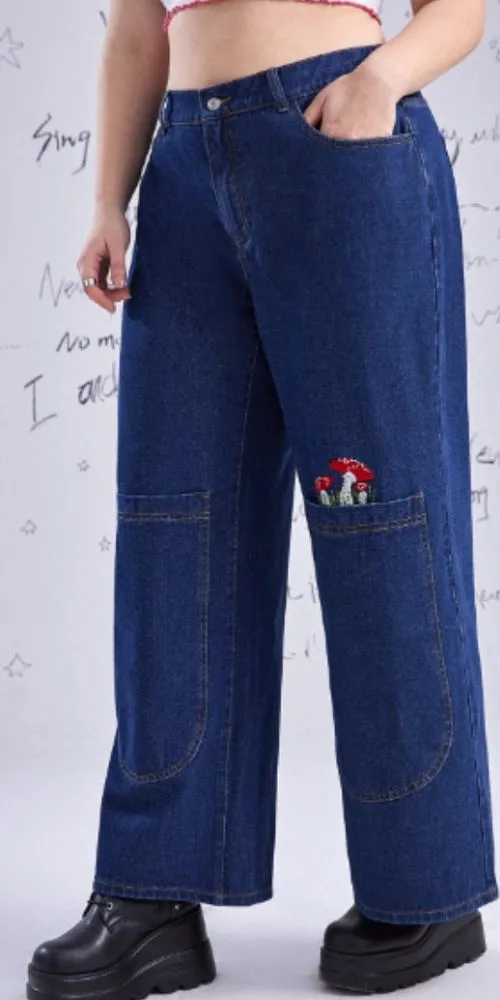 ROMWE Women's Mushroom Embroidery Wide Leg Jeans Blue Denim Size 0XL Soft and comfortable high qua... Show more