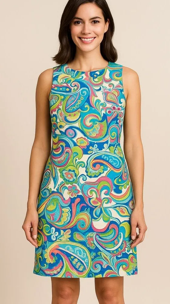 This Ronnie Nicole sheath dress features a colorful paisley pattern in blue, green, and pink hues. Perfect for summer, this dress measures 19 inches in the bust and 34 inches in length. #Paisley #SheathDress #SummerDress #WomensFashion