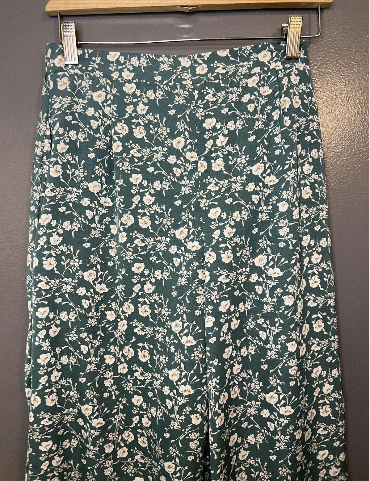 Gently worn with fabric clean and intact throughout. No stains, holes, or snags. Elastic waistband in good shape with light wrinkling from storage. Brand: ROOLEE Style: Womens high-rise wide leg pants with an allover floral print and elastic waist. Color: Dark green with white floral pattern. Size on tag: Small (S). Materials: Self 100% polyester; lining 100% polyester. Details: Pull-on style, elasticized waistband, fully lined for coverage, flowy wide legs, lightweight drapey fabric suitable for casual or everyday wear. Style code on tag: PRO-RIP507; PO 11916; made in China. Waist lying flat 24" stretches to about 34" Inseam 28" bin 59 2247