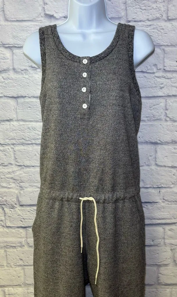 The Roots Canada Cabin Collection Women's Jumpsuit in grey is a versatile and comfortable one-piece garment perfect for various occasions such as travel, activewear, parties, casual wear, and workwear. Made from cotton knit fabric, this sleeveless jumpsuit features a button closure, pockets, and a 28-inch inseam. The athleisure style with a solid grey color and a touch of hipster and nature themes make it a trendy and comfortable choice for women looking for a modern and effortless outfit. Machine washable for easy care, this jumpsuit is a must-have for any fashion-forward wardrobe. Underarm to underarm 17.5 Drawstring waist In excellent condition W89