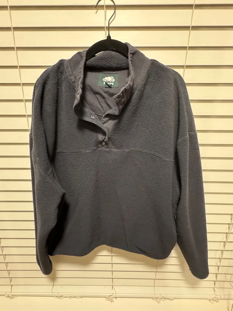 Cozy and classic, this Roots fleece pullover is perfect for layering on chilly days. Made with ultra-soft fleece fabric, it delivers warmth without being too heavy. The pullover features a stand collar with button snap closure, giving it a versatile look that can be worn open or closed for extra coverage. Its relaxed fit and timeless dark gray color make it an easy go-to for casual wear, outdoor adventures, or lounging at home. Key Features: Authentic Roots quality and craftsmanship Soft fleece material for warmth and comfort Snap-button collar closure for adjustable coverage Relaxed, casual fit