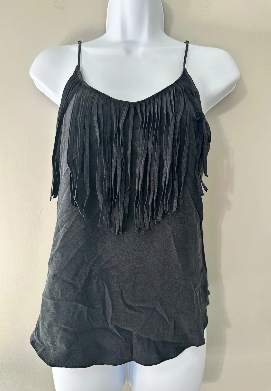 Type: Tank Department: Women Style: Camisole Material: Silk Neckline: Scoop Neck Sleeve Length: Sleeveless Sleeve Type: Strappy Sleeve Accents: Fringe, Strap Pattern: Solid Theme: Boho Chic, Festival, Bohemian, Party Features: Straps, Keyhole Neck Fit: Regular Keywords: Rosie Becca, black silk top, fringe top, sleeveless top, tank top, womens blouse, bohemian, festival style, silk blouse, casual top, party top, xs size, black top All pre owned clothing will be cleaned according to care instructions with unscented detergent. All items stored in polybags Comes from a smoke free home
