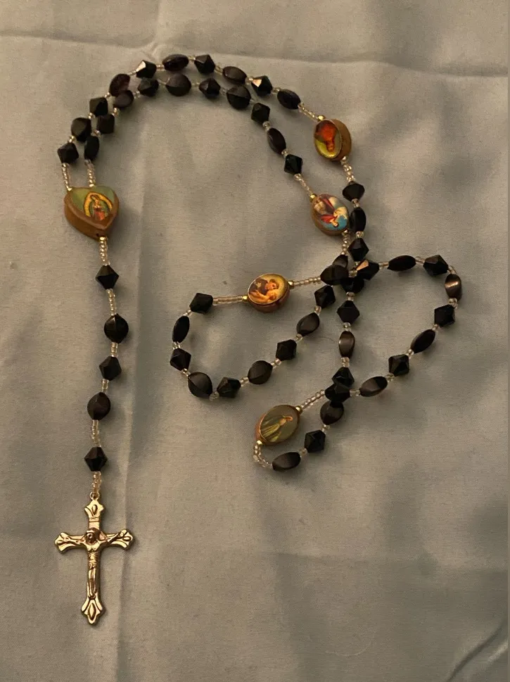 Rosary Necklace Silver Cross Black & Wood Photo Beads 20” Long - $10 - From Terri