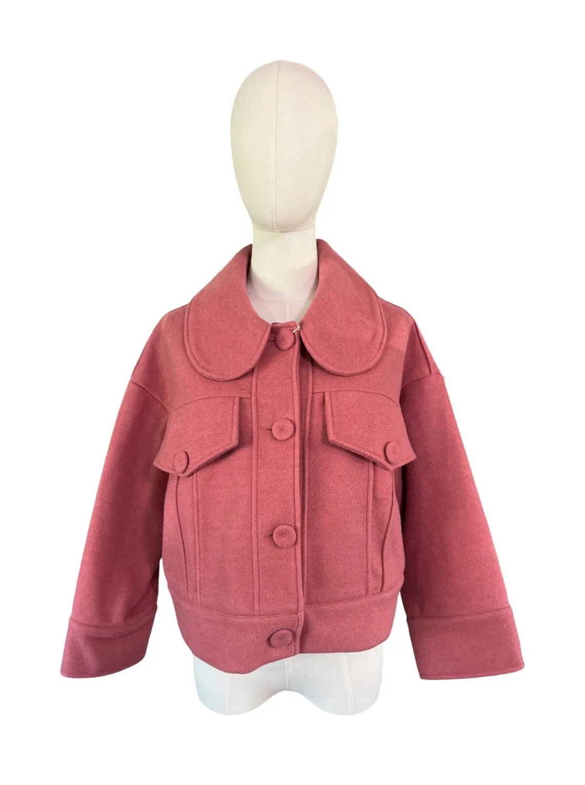 Beautifully crafted in Italy, this Rosé a Pois “Syrah” jacket combines timeless femininity with modern tailoring. Rendered in a warm rosa antico (antique rose) tone, it features a cropped, boxy silhouette, oversized Peter Pan collar, and sculptural covered buttons that add soft structure. Details / Highlights: Brand: Rosé a Pois Style: “Syrah” Giacchino in Panno con Tasche Made in Italy 🇮🇹 Size: IT 38 - please see measurements; oversize boxy fit for sizes S-M Color: Rosa Antico / Antique Rose (Col. 4008) Fabric: 43% PC, 29% PL, 28% WV (polycarbonate / polyester / wool blend) Cropped boxy silhouette with full button front Rounded Peter Pan collar Flap front pockets with covered buttons Fully finished interior seams Lightweight structured wool-blend fabric Care: Hand wash cold, low iron, do not bleach or tumble dry Condition: New with tags (includes spare button and tag set) Approximate measurements: Pit to pit: 22" Length: 20" Sleeve: 18" Rosé a Pois, Italian designer jacket, cropped wool coat, pink jacket, made in Italy, boxy jacket