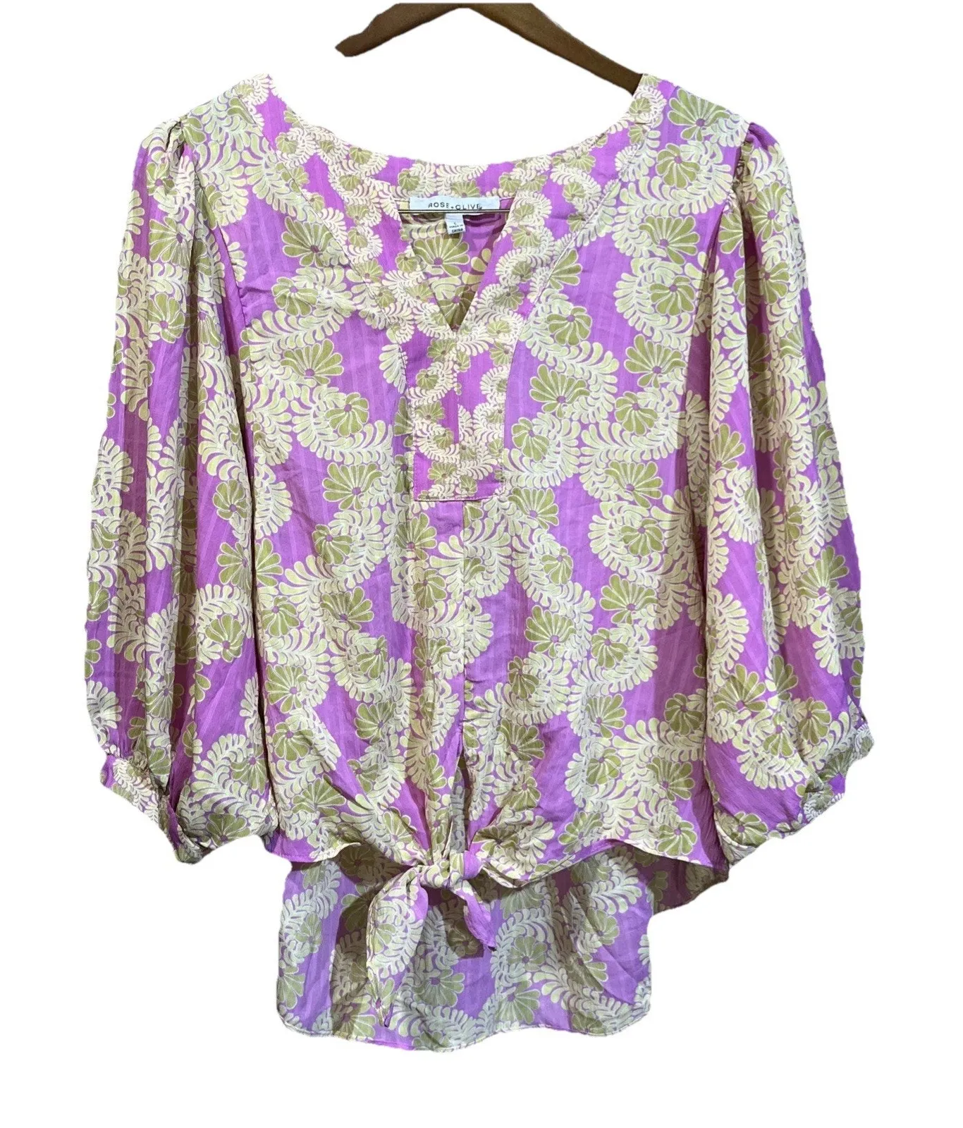 Oversized tie front blouse. Big dolman balloon sleeves. Fun pink and green floral pattern. 97% Polyester 3% Spandex. Hand washable Very good preowned condition. No stains or holes. Measurements are approximate Chest 21 inches across pits Length 21 inches Sleeve length 17 inches