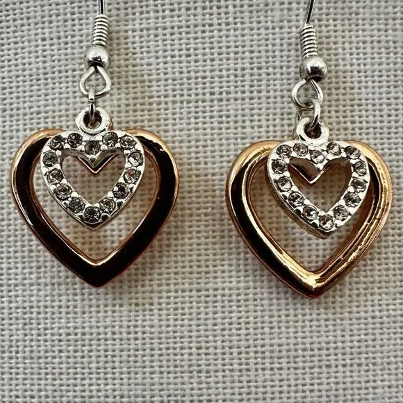 💖 Rose Gold Tone Heart Drop Earrings with Rhinestone Accents 💖 These adorable heart dangle earrings feature a rose gold tone open heart with a sparkly rhinestone-studded heart floating in the center. Super lightweight and flirty, perfect for adding a little love to your everyday look! - Rose gold tone finish with silver-tone rhinestone hearts - Lightweight and comfortable to wear - Approximate drop length shown in photos with ruler ✨Condition: Excellent pre-owned condition! Bundle to save! Free gift with a purchase of 3 or more items. Photos are part of the description. Reasonable offers welcome! #HeartEarrings #RoseGold #RhinestoneJewelry #CostumeJewelry #CuteEarrings #GiftIdeas #ValentinesDay