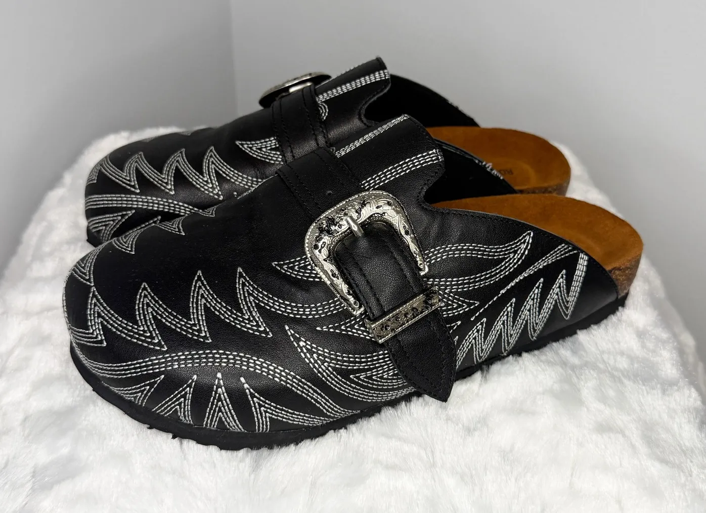 Rose In Good Faith Dark Cowboy Mules featuring a contoured cork-latex footbed, black leather upper, and white contrast stitching. Chic, modern Western style. Size 39 NWOT—never worn.