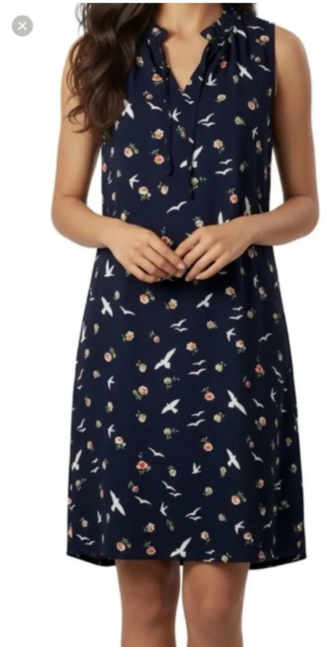 Charming navy midi dress with bird and floral print. Sleeveless design. Perfect for versatile styling. Measurements are in the photos. Please refer to photos for fit prior to ordering. Preowned. Gently used with minimal wear. See photos for details