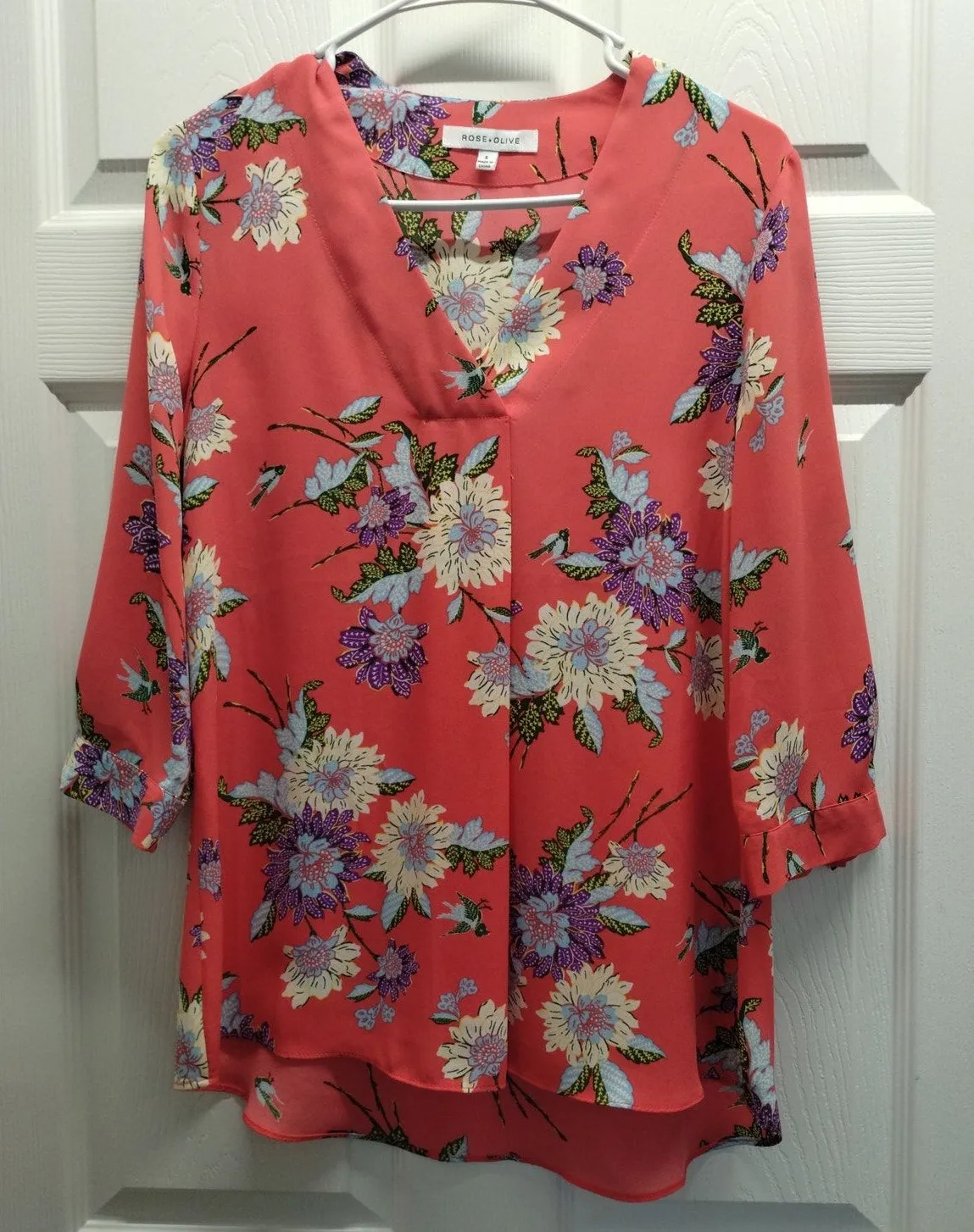 Rose + Olive Women's Size Small Salmon Pink Orange 3/4 Sleeve Floral V-Neck Top Excellent preowned condition, see photos. 18 1/2 inches pit to pit. 26 inches long on the front. 28 1/2 inches long on the back. 100% polyester.
