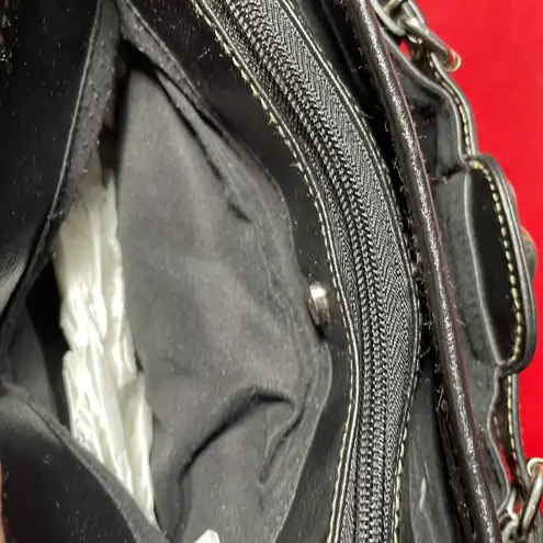 Good preowned condition. Scratches on the silver tone front logo detail. Some pilling on interior fabric Faux leather exterior Braided shoulder strap Silver tone buckle and logo hardware Slouchy soft hobo shape Top zip closure Front decorative belt detail Comfortable shoulder drop Wipe clean exterior All measurements are approximate Width: 13 Height: 8 Strap drop: 10 rosetti bag, black shoulder bag, faux leather purse, hobo bag, braided strap bag, y2k bag, minimalist purse, slouchy handbag, casual purse, everyday bag, workwear style, vintage inspired