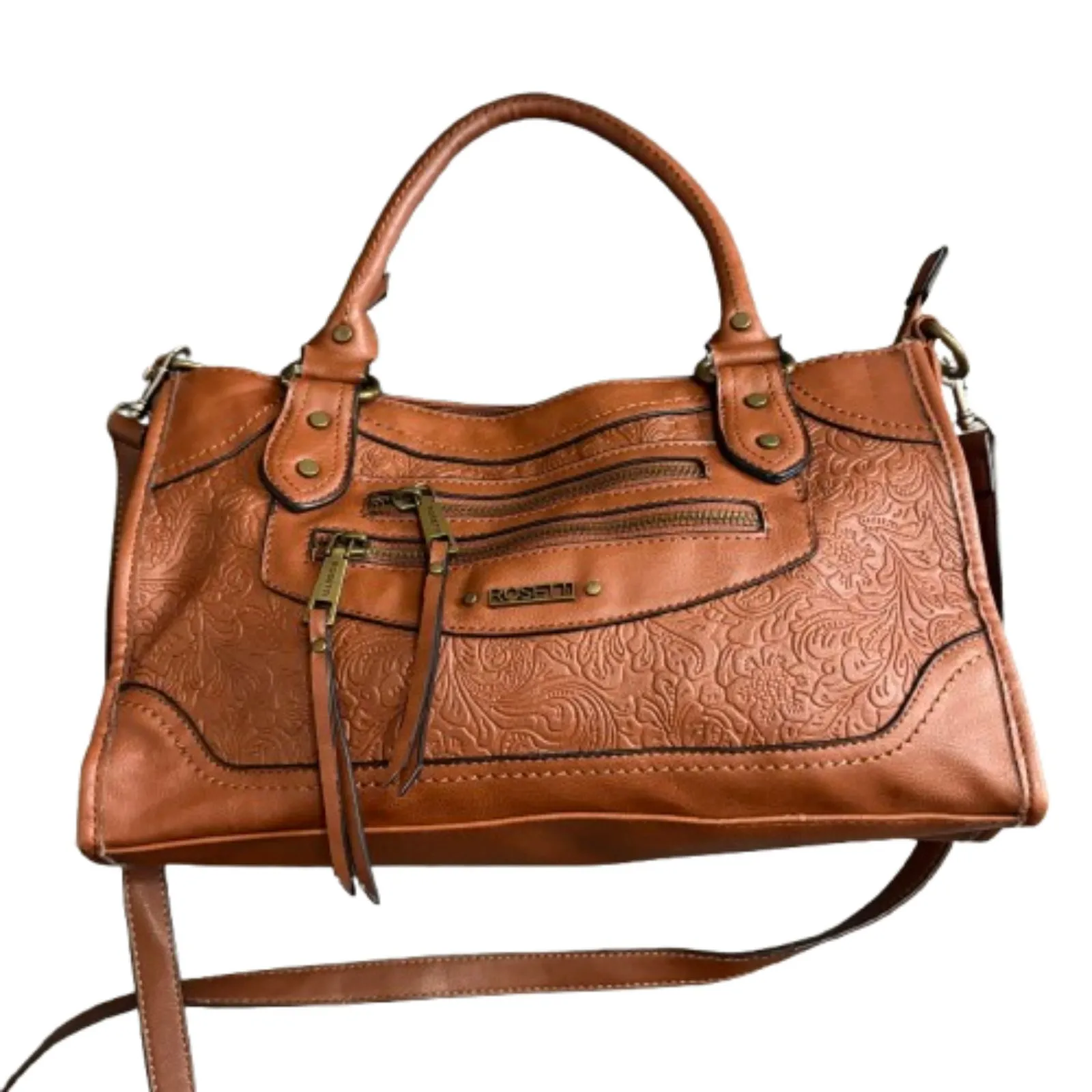Rosetti Tooled Faux Leather Crossbody Bag Tan Western Bohemian Floral Good used condition with some cracking around the base of the handles, but otherwise clean and structurally sound. Top handle and detachable crossbody strap. Faux leather with tooled leather look. Approximately 13 x 7 x3.5 inches. cute, western, boho chic, bohemian, feminine, classic, everyday bag Thank you so much for shopping with me, and please let me know if you have any questions! Offers are always welcome. Bundle to save.