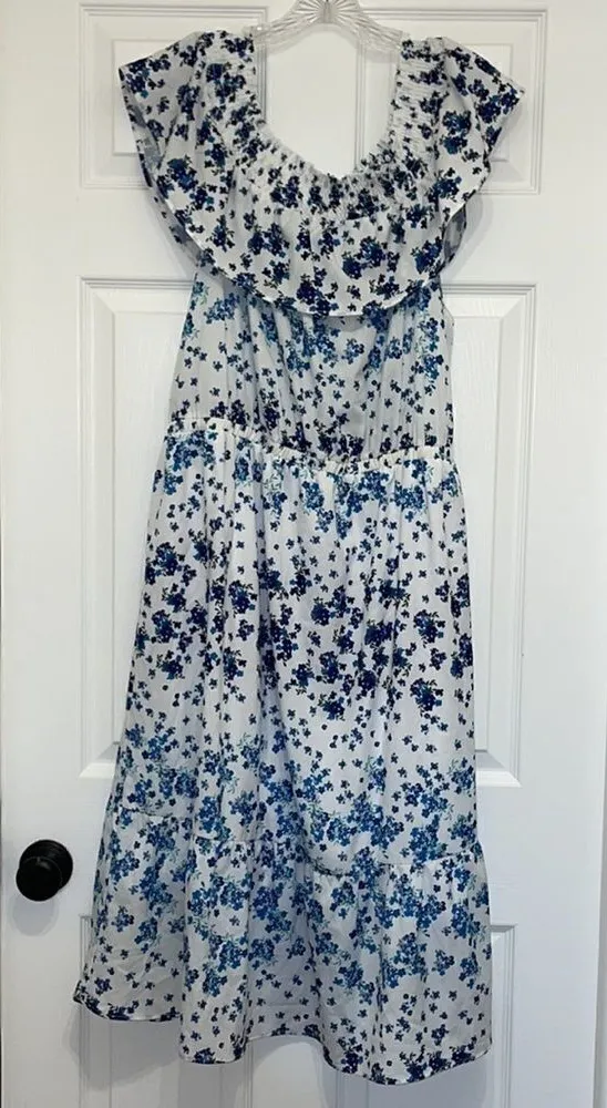Rosie Pope Maternity Blue & White Floral Serena off the shoulder Dress, size large. New with tags! A... Show more