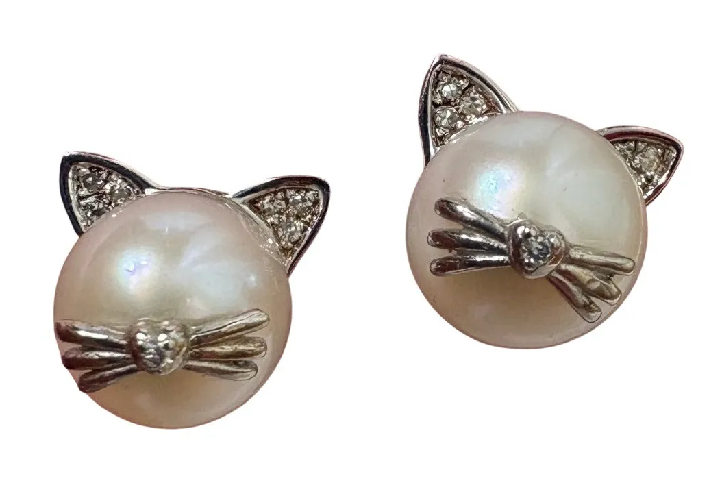 Adorable pearl cat face stud earrings. These charming earrings feature lustrous pearls as the cat's face, accented with diamonds for the ears and a tiny bow tie nose. The sterling silver setting is intricately designed to resemble a cute feline face. Perfect for adding a touch of playful elegance to your everyday look or as a delightful gift for cat lovers. Suitable for casual outings, work, or a special occasion. 8-8.5mm cultured pearl cat earrings with diamonds. Cultured freshwater button pearls. Polished finish. 3/8 in. wide. Post/clutch backings. Diamonds were electronically tested prior to listing and verified as genuine. Condition- Excellent used condition- all stones in place Style: Stud Main Stone Color: White Closure: Butterfly Theme: Animals & Insects Main Stone: Shell Metal: Silver Shape: Round Type: Earrings Material: Pearl, Diamond Main Stone Creation: Cultured Main Stone Shape: Round Metal Purity: 925 Setting Style: Pavé Ear Area: Lobe Keywords: pearl earrings, cat earrings, sterling silver, diamond studs, animal jewelry, cute earrings, gift for her, dainty earrings, fashion jewelry, statement earrings, unique studs, whimsical jewelry