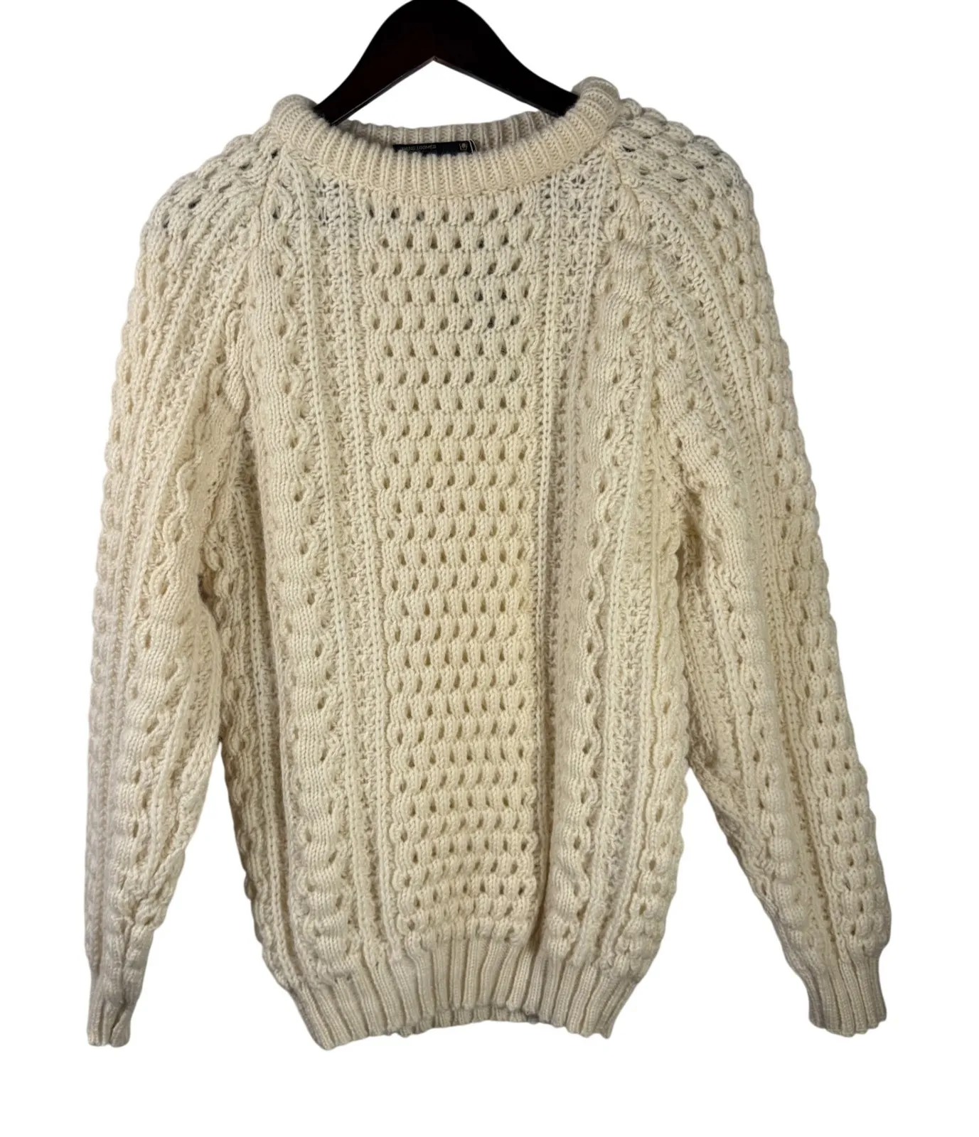 Beautiful authentic Irish Aran sweater by Rossan Knitwear, crafted from 100% Pure New Wool and made in Ireland. This sweater features traditional Aran cable and honeycomb stitch patterns, a hallmark of classic Irish knitwear known for durability, warmth, and timeless style. A classic, well-made knit that never goes out of style. • Material: 100% Pure New Wool (Woolmark Certified) • Size: Small • Condition: New without original retail tags (Woolmark tag attached) • Country of Manufacture: Ireland • Care Instructions: Hand wash Measurements (Flat, Approximate) • Pit to Pit: 20.5" • Length: 28" Rossan knitwear, Irish wool sweater, Aran cable knit, fisherman sweater, pure new wool sweater, Woolmark certified, made in Ireland sweater, heritage knitwear, classic Irish sweater, cottagecore, coastal, traditional knit