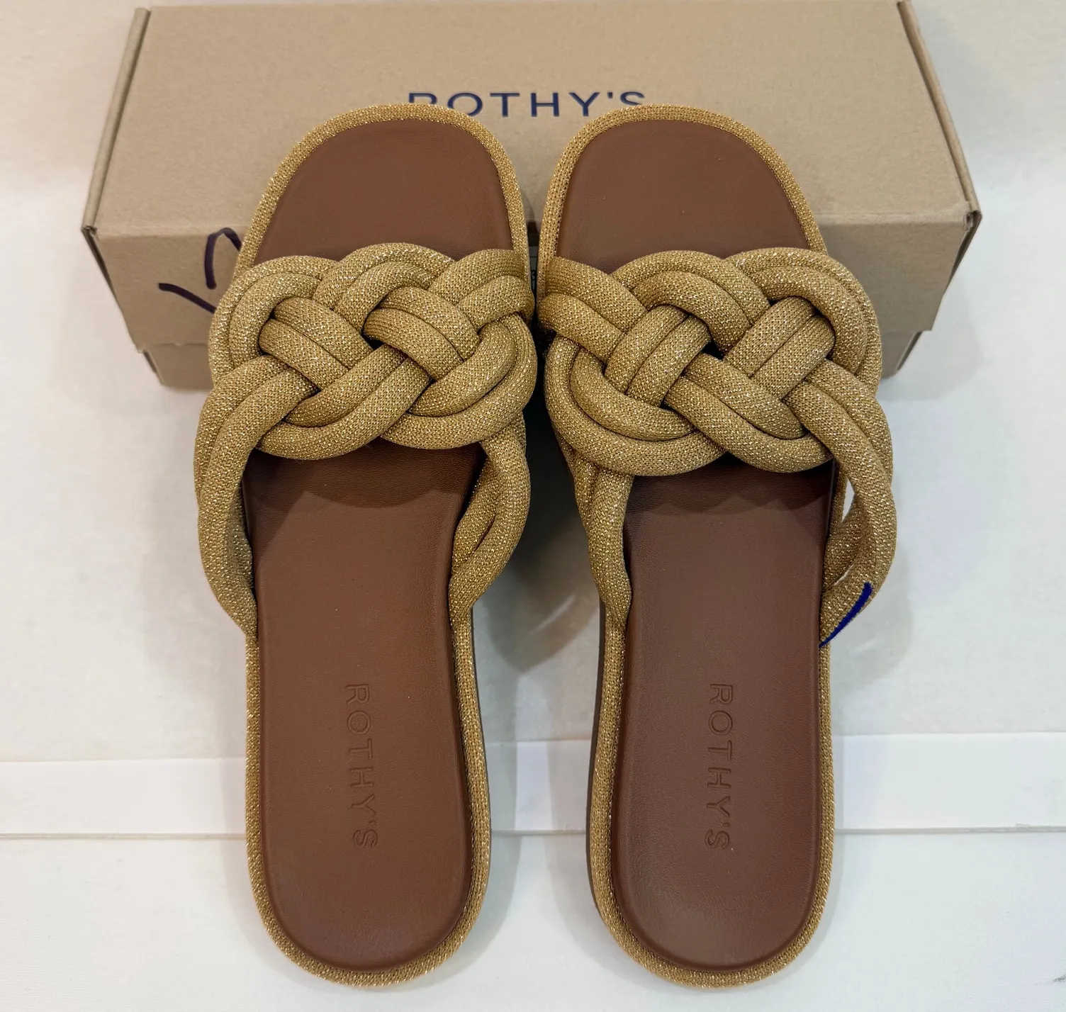 Rothy's "The Summer Sandal" slide-on sandals. Women's size 9.5 Color: "Golden Sun" Cushioned, interwoven straps in a shimmery metallic bronze Light and airy with a luxe style Square-toe, cushioned footbed in brown EVA outsole Machine washable *Ships same day or next business day*