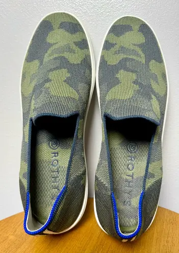 Excellent used condition. The Original Slip On Sneaker in Camouflage Soft, flexible upper in green camouflage. Comfortable insoles in Rothy’s blue and durable outsoles in white. Features a Rothy’s blue and black heel stripe for a sporty touch.