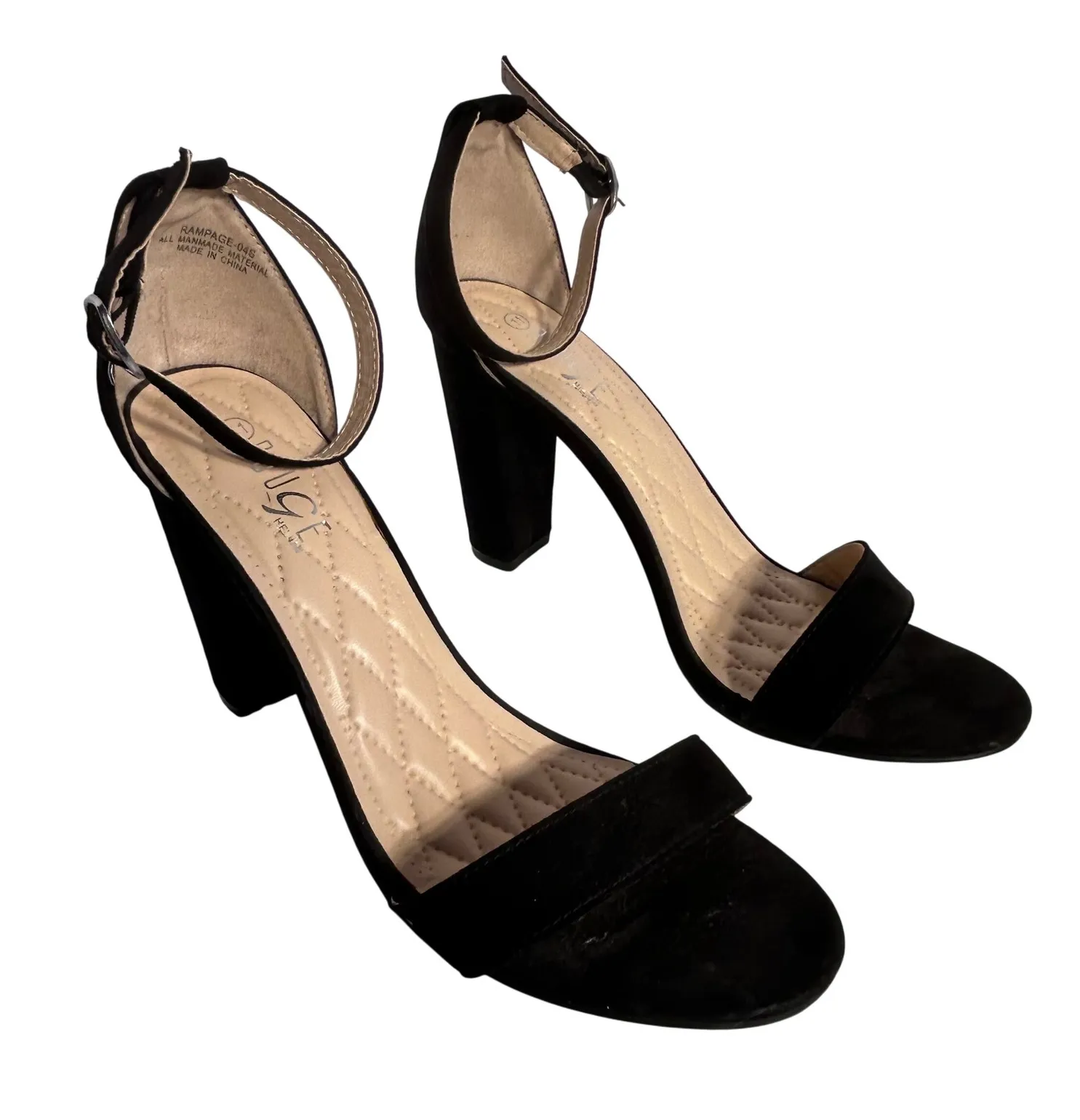 ROUGE black faux suede ankle strap block heel sandals. These stylish heels feature a comfortable quilted footbed and an adjustable ankle strap with buckle closure. The block heel provides stability and a modern silhouette. Shoe model RAMPAGE04S. Excellent condition- some wear on heels Style: Strappy Department: Women Upper Material: Suede UK Shoe Size: 9 AU Shoe Size: 11 Heel Style: Block EU Shoe Size: 42 Features: Ankle Strap, Cushioned, Adjustable Strap Closure: Buckle Pattern: Solid Accents: Quilted Heel Height: High (3-3.9 in) Type: Sandal Keywords: black heels, suede sandals, ankle strap, block heels, dressy shoes, evening shoes, party heels, fashion heels, comfortable heels, wide heel, closed toe, open toe, strappy heels Fast shipper- most item ship within 1 day!