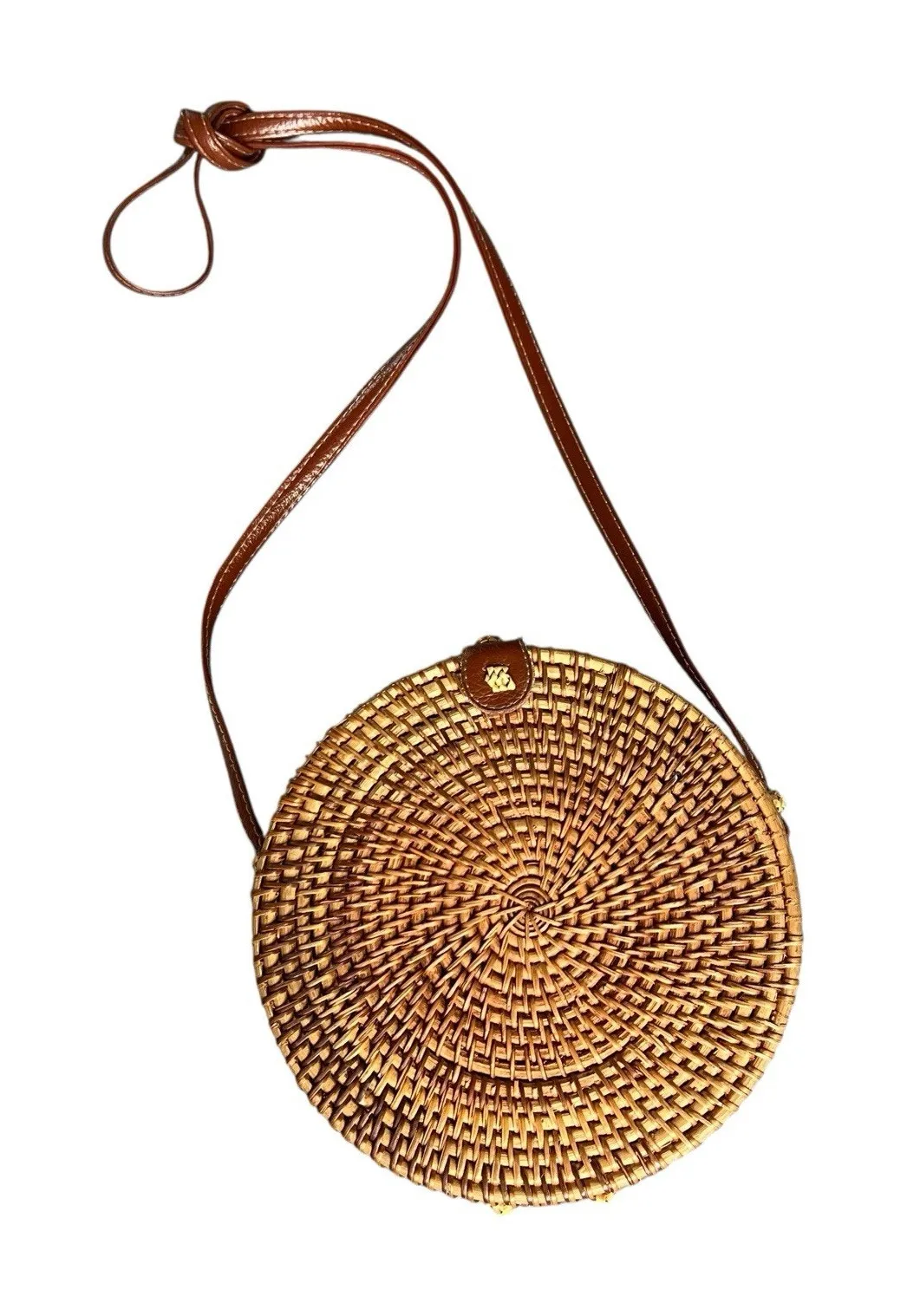 Rattan Straw Bag Round rattan bag Floral lining on blue background Snap closure Faux leather crossbody strap Color: brown Approximate Measurements Diameter: 8" Depth: 3" Strap Drop: 22" Condition: Good pre-owned condition. On one side the area where the strap attaches to the bag has been repaired. See pictures.
