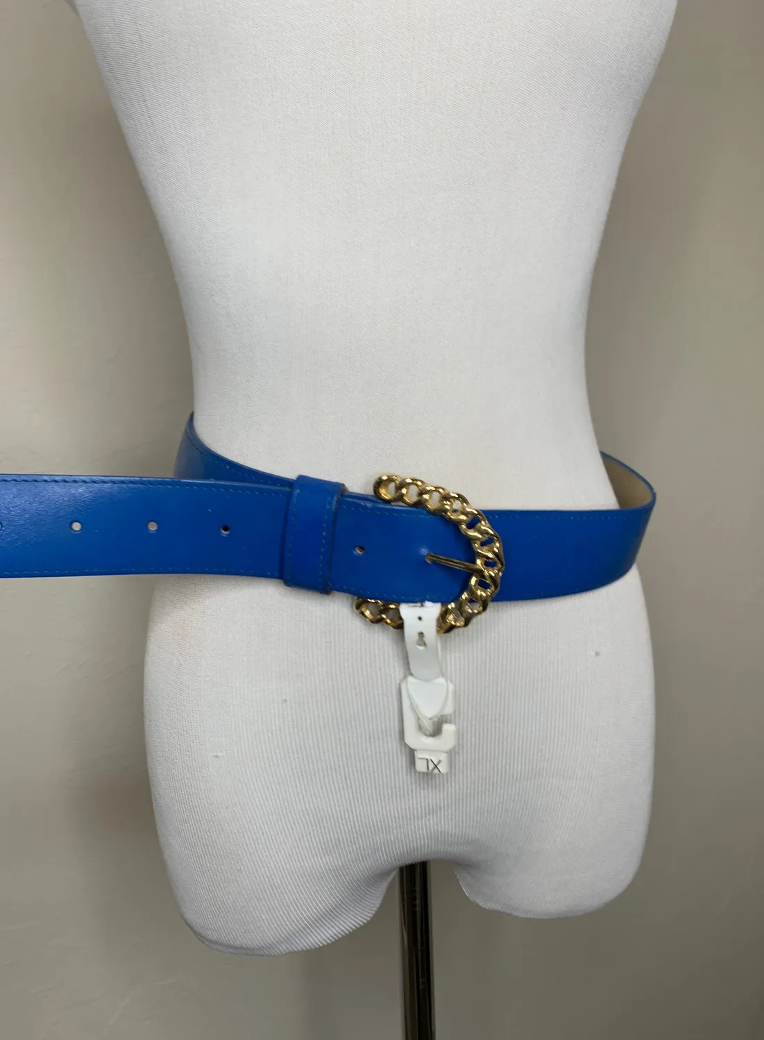 Royal Blue Deadstock Wide Belt Gold "Chain" Buckle Sz XL 1.5" wide 44" plus buckle 2" wide and 2.5' tall Some shelf storage wear on this belt Bonded leather labeling on the inside O1-5