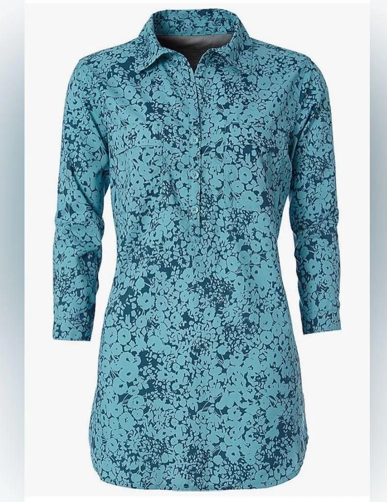 Designed with cooling, moisture-wicking fabric and built-in UPF sun protection—perfect for travel, hiking, and warm-weather adventures. Flattering tunic length offers versatile styling with leggings, pants, or shorts.
