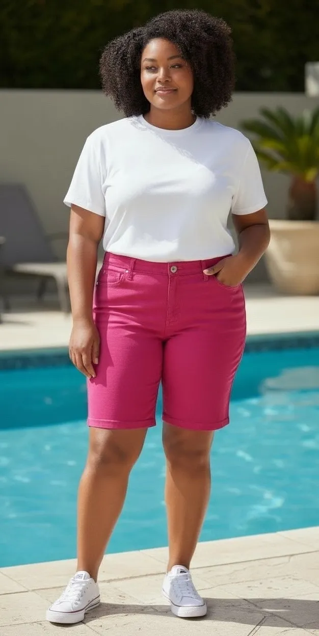 Discover vibrant comfort with these Royalty For Me Bermuda shorts. The rich teaberry hue offers a playful pop of color to your wardrobe, while the classic denim construction ensures lasting style and durability. Designed with a flattering fit, these shorts provide effortless ease for everyday wear. Perfect for a casual brunch, a day at the park, or a relaxed vacation getaway. Measurements: • Waist: 48 in • Inseam: 9 in • Rise: 12 in • Leg Opening: 14 in Style: Bermuda Department: Women Fabric Type: Denim Material: Spandex Occasion: Casual Accents: Button Pattern: Solid Features: Pockets, Stretch Waist Size: 24 in Fit: Classic Front Type: Flat Front Keywords: Royalty For Me, denim shorts, bermuda shorts, plus size, curvy fit, bright pink, summer fashion, casual wear, street style, comfortable, everyday, warm weather, playful color, stylish Box P