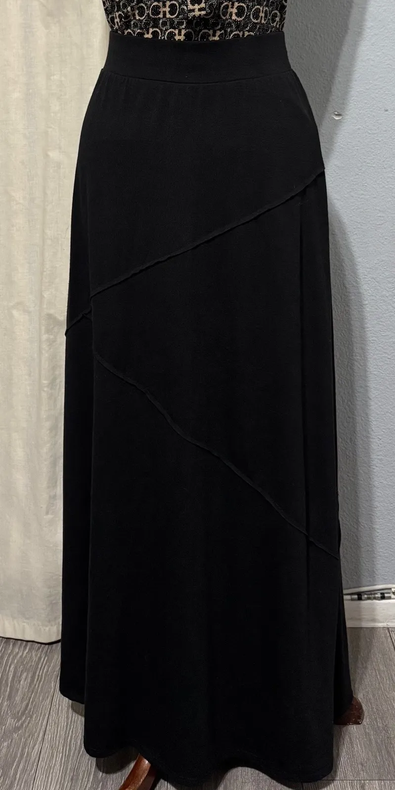 A versatile black maxi skirt by Roz & Ali. This skirt features an elastic waistband for comfortable wear and a flattering A-line silhouette. The paneled design adds a unique, modern touch to the classic maxi style. Perfect for casual outings, travel, or as a foundational piece for sophisticated workwear. Preowned - Good condition Measurements: • Waist: 30 in • Length: 39 in Type: Skirt Style: Maxi Skirt Length: Long Department: Women Material: Polyester, Rayon, Spandex Pattern: Solid Accents: Layered Fabric Type: Knit Features: Asymmetric, Elastic Waist, Stretch, Lightweight, Full Theme: Bohemian Closure: Pull On Rise: Mid Occasion: Casual, Party/Cocktail Keywords: Roz & Ali, maxi skirt, paneled skirt, elastic waist, ALine skirt, black skirt, womens skirt, casual, travel, workwear, comfortable, versatile, modest
