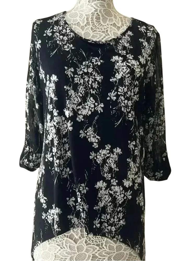 Chic black and white floral print blouse with sheer lightweight fabric. Features 3/4 sleeves, scoop neckline, and a flattering high-low hem. Perfect for layering or dressing up jeans and trousers. Like new condition Measurements laying flat: PTP 21” Top to bottom front side 26” floral blouse, sheer top, high low tunic, black white print, 3/4 sleeve, flowy blouse, lightweight, elegant, boho chic, feminine, dressy casual, office style