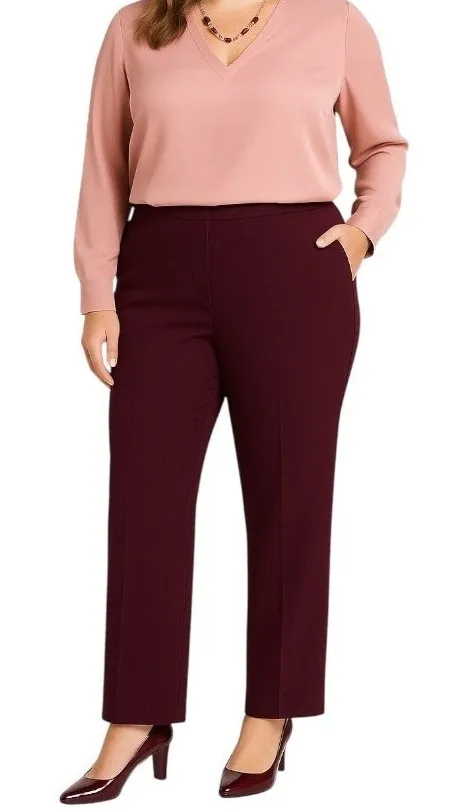 Style Details • Secret Agent pants • Classic straight leg trousers • Slimming tummy panel • Flat front, mid rise • Pull on style • Functional front pockets • Faux back pockets • Solid burgundy/maroon • Polyester, rayon & spandex • Machine washable • Excellent used condition Approximate Measurements • Size 16 - stretches • 18” across waist • 30” inseam, 10” rise • Measurements taken across laying flat Classic spring summer fall winter maroon easy wear business casual plus size curvy minimalist work office professional career transitional versatile maroon wine burgundy merlot modest