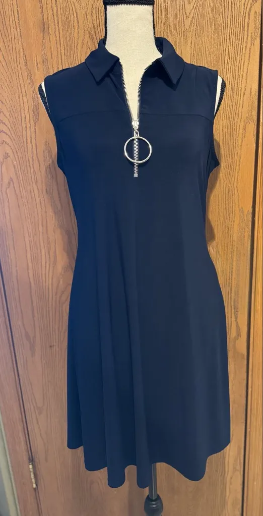 Elegant navy sleeveless dress featuring a stylish zipper detail. Perfect for any occasion. It has lo... Show more
