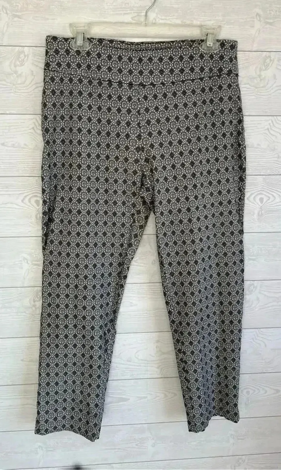Roz & Ali stretch ankle pants. Black & white Fleur De Lis pattern. Wide waist band, side seam slit at ankle. Rayon/nylon/spandex blend. Excellent preloved condition. Approximate measurements waist 15.5”, rise 10”, inseam 26.5”. Size 14. #casual #anklepants #workwear #businesscasual #comfortable