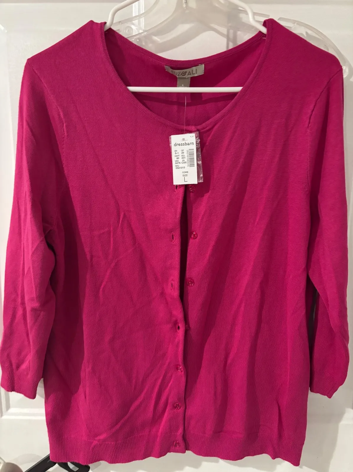 Radiant charm unfolds with this vibrant pink cardigan. A classic silhouette is reimagined with a modern touch, offering a flattering fit and comfortable wear. The button-front design allows for versatile styling, while the 3/4 sleeves add a touch of sophistication. This cardigan is perfect for layering over a blouse for a polished office look or pairing with jeans for a casual weekend outing. Imagine wearing it to a brunch with friends or a relaxed evening at home. Keywords: Roz & Ali, cardigan, sweater, knit, button front, 3/4 sleeve, pink, large, womens, casual, office, layering, classic, comfortable