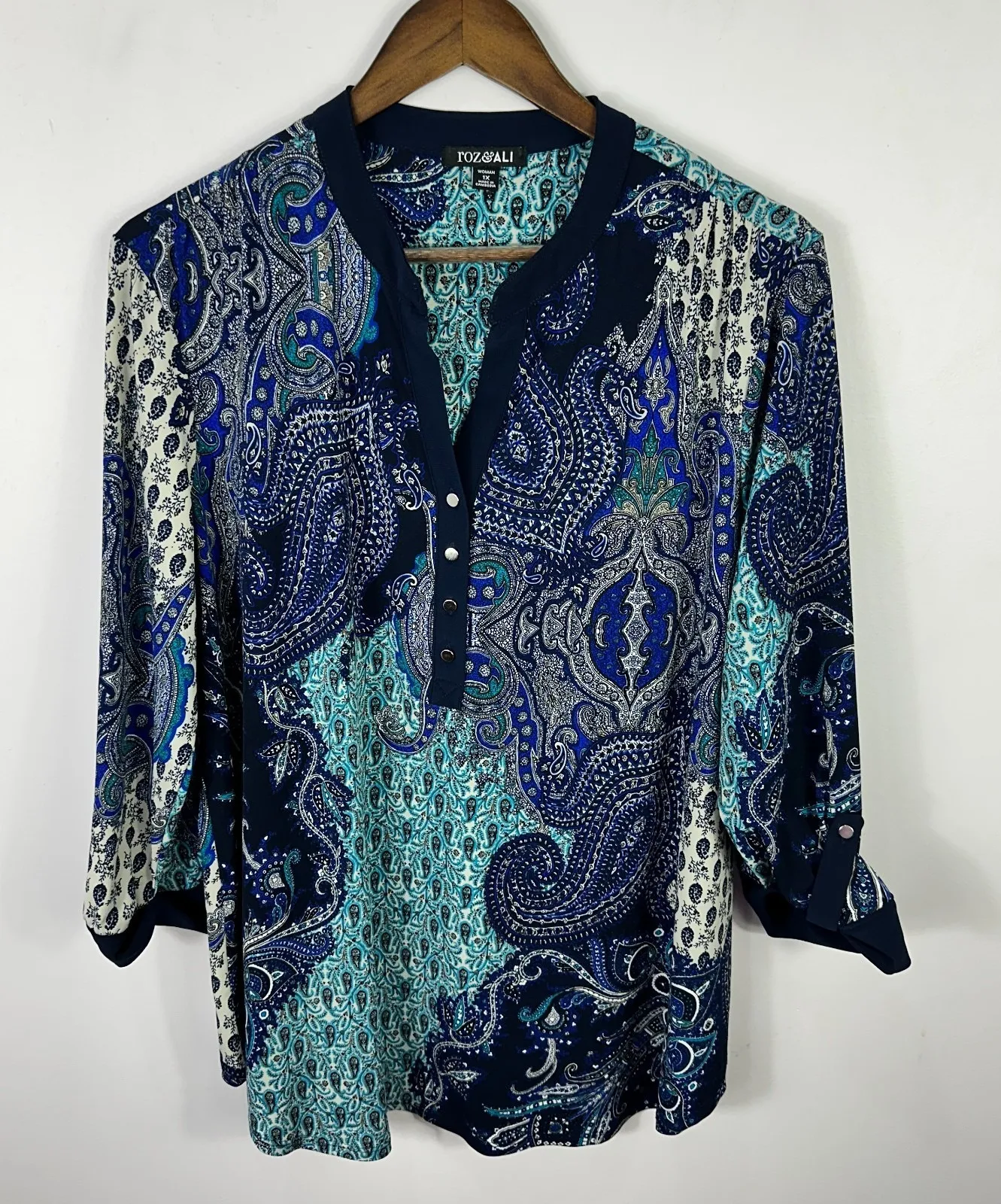 Size: 1X Color: Navy blue, turquoise, ivory Fabric: 95% polyester, 5% spandex Paisley mixed print Split neckline with button placket Roll-tab 3/4 sleeves Stretchy, wrinkle-resistant Made in Cambodia boho, career chic, office casual, travel wardrobe, resort wear, feminine, modern classic, boutique style, polished bohemian, mature #RozAndAli #BohoStyle #PlusSizeFashion #PaisleyTop #Workwear