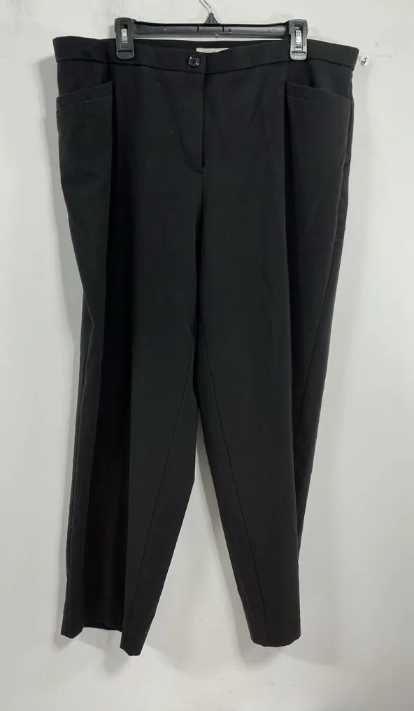 This is a pair of black dress pants for women by the brand Roz & Ali, specifically designed for plus size women in size 18. These pants have a 11.5 inch high rise waist, with a waist size of 40 inches and an inseam of 29 inches. Made from a blend of polyester, spandex, and rayon, these pants offer comfort and style for a dressy look. Perfect for various occasions, these pants are a versatile addition to any woman's wardrobe. They have a zip/button front closure. Measurements are appropriate. These pants are pre owned and look to be in good condition!