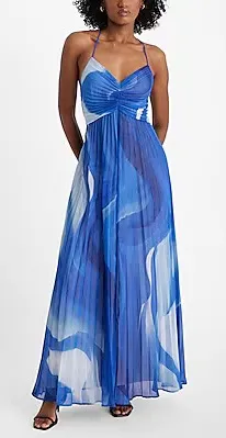 Printed V-Neck Pleated Cross Back Maxi Dress