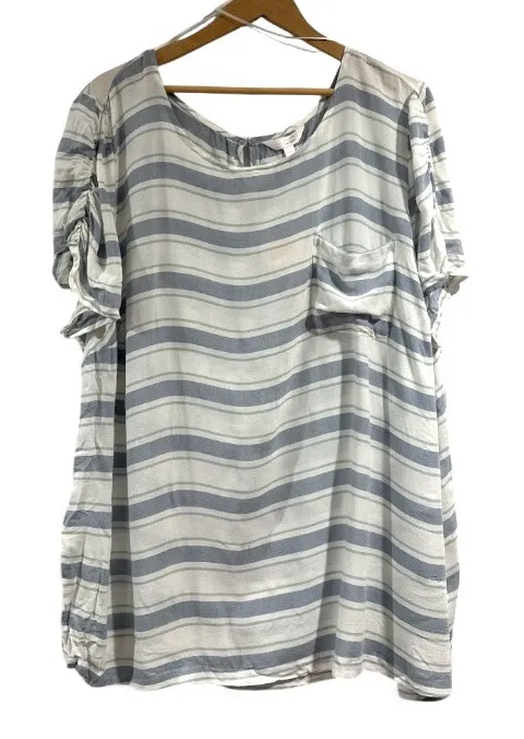 Lauren Conrad blouse woven striped Short sleeve ruched 3X lightweight 100% rayon Appprox 32” long,... Show more