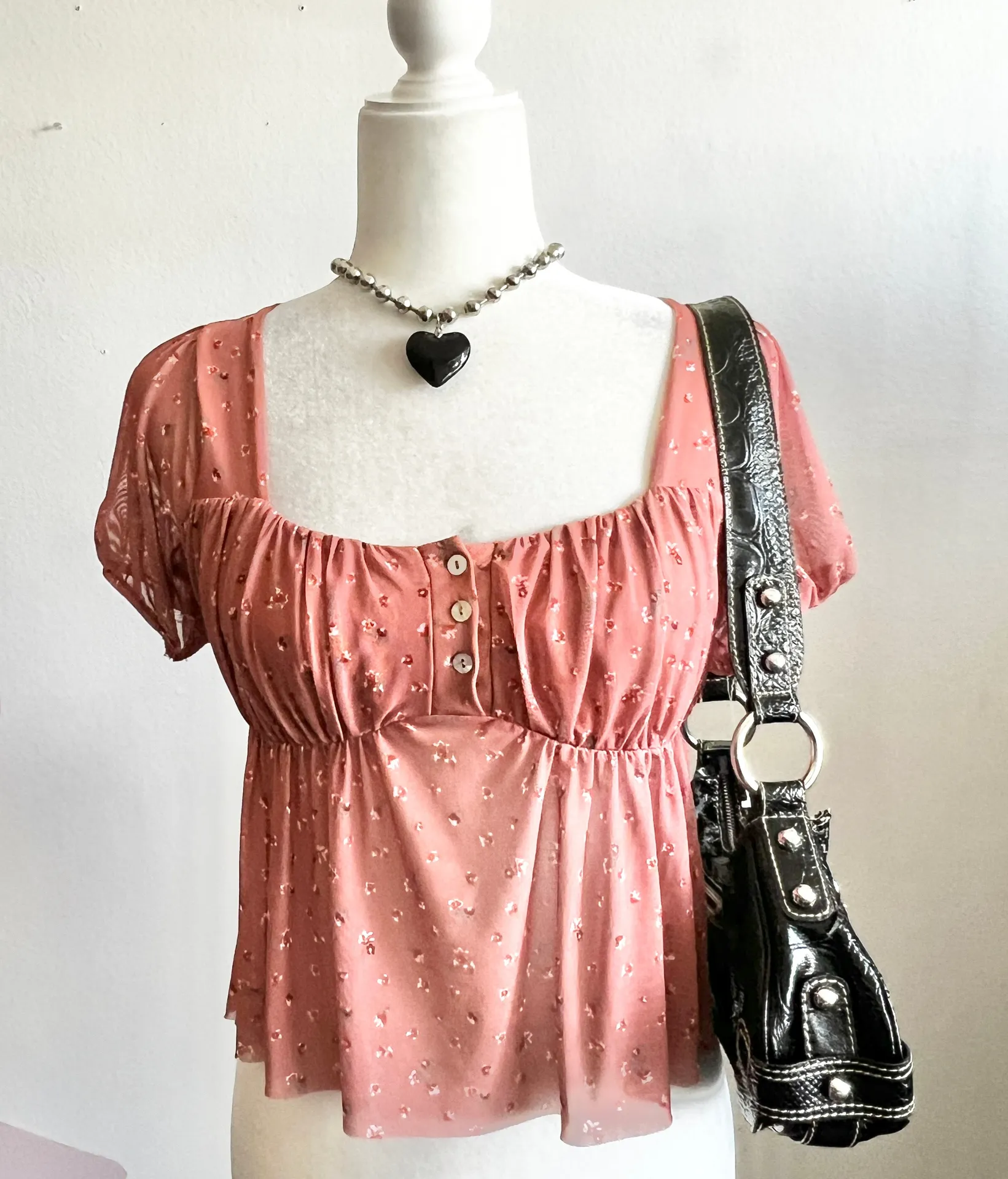 Pink Mesh Floral Babydoll Top Milkmaid Y2K Retro‎ Indie Cottagecore Soft Girl XS - $17 - From Kenia